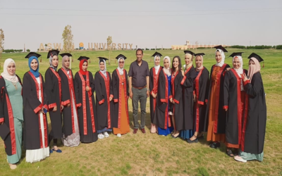 طلاب تخرج كلية العلوم يلتقطون الصور التذكارية أمام الحرم الجامعي بصحاري