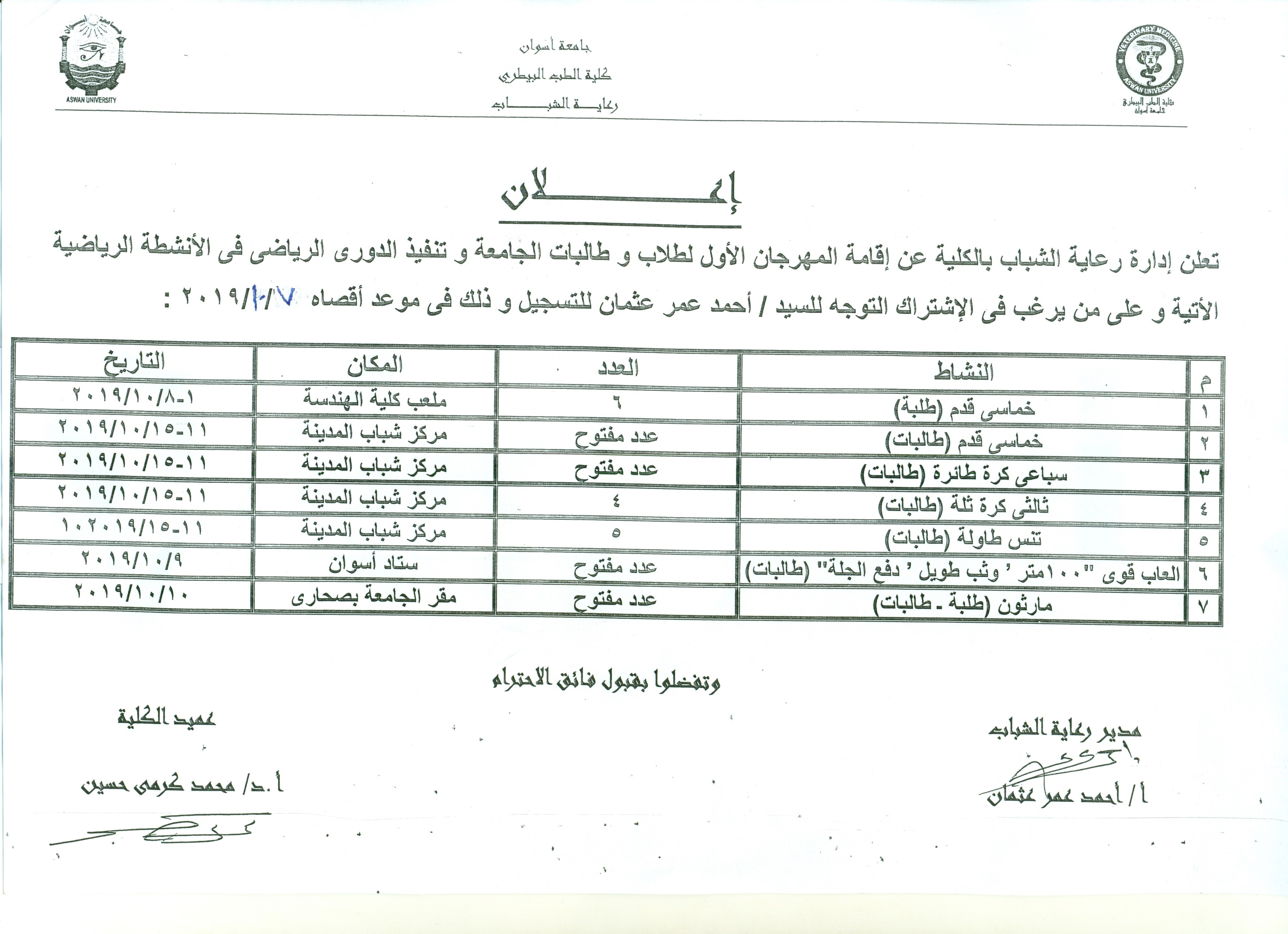 The administration of students’ welfare announced holding the first festival all students of the university and implementing the sports league in the next sports activities and all who want to subscribe go to Mr.Ahmed Omar Osman to register and the deadline 7/10/2019 ….for details.