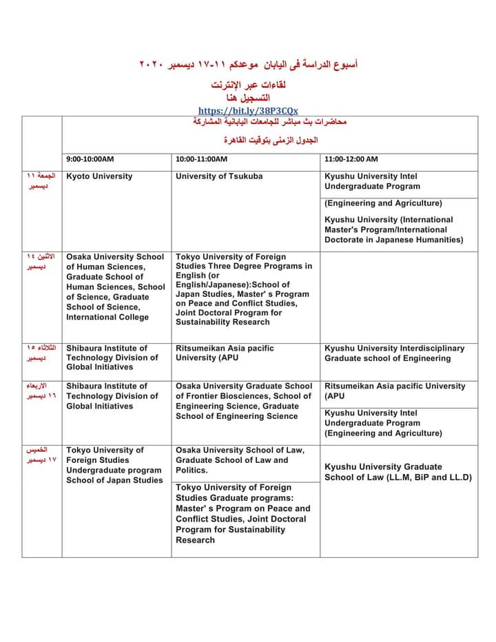 دعوة عامة لحضور فعاليات التعرف علي الدراسة اونلاين في اليابان من 11-17 ديسمبر 2020